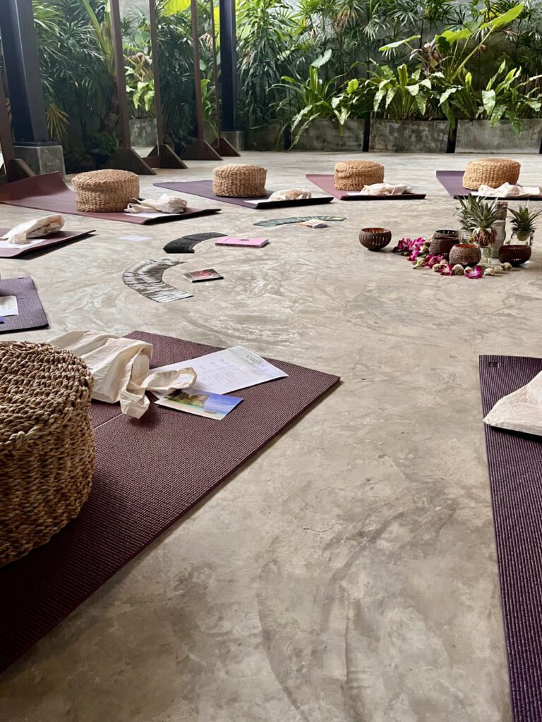 The open-air Shala / Practice Space is one of the quiet anchors of Lan Sabai. It’s shaded, spacious, and catches the natural breeze. Morning sessions feel calm and grounded here. Afternoon practices move slowly with the heat. Evenings can feel almost still, with only the soft sounds of the surrounding landscape.